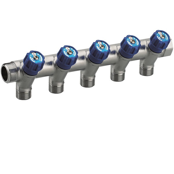 Cada salida está equipada de una válvula con prensaestopas monobloque, equipada de una manilla azul, que le permite de aislar individualmente la llegada de agua de cada aparato alimentado gracias a la identificación del aparato alimentado sobre la manilla, ideal para intervenir sobre una parte de la instalación sin tener que cortar el paso de agua general