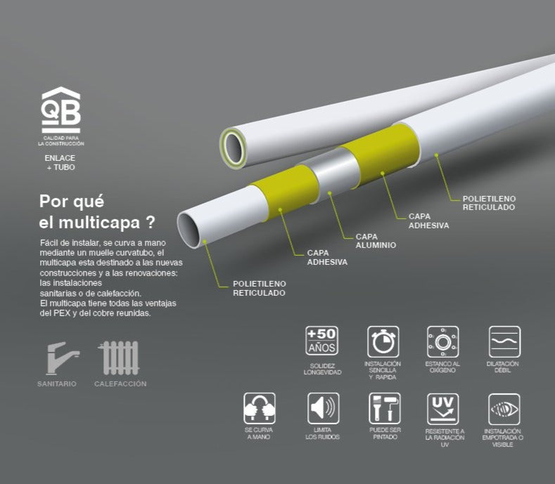 El espesor del aluminio, tomado entre las 2 capas de PER, protege el tubo de los UV y del oxígeno, impidiendo así la formación de barro o de bactérias al interior del tubo