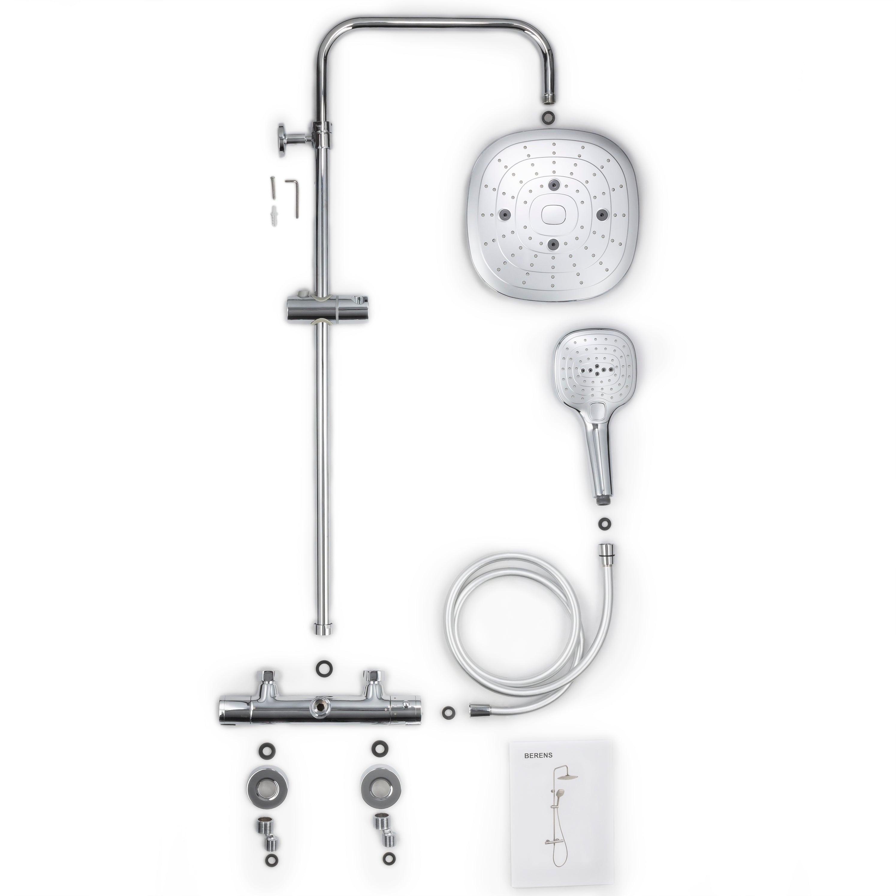 La columna de ducha BERENS junta comodidad y diseño, con su acabado cromado elegante y sus componentes de alta calidad. El Rociador y la ducha de mano se presentan en forma cuadrada con angulos redondeados