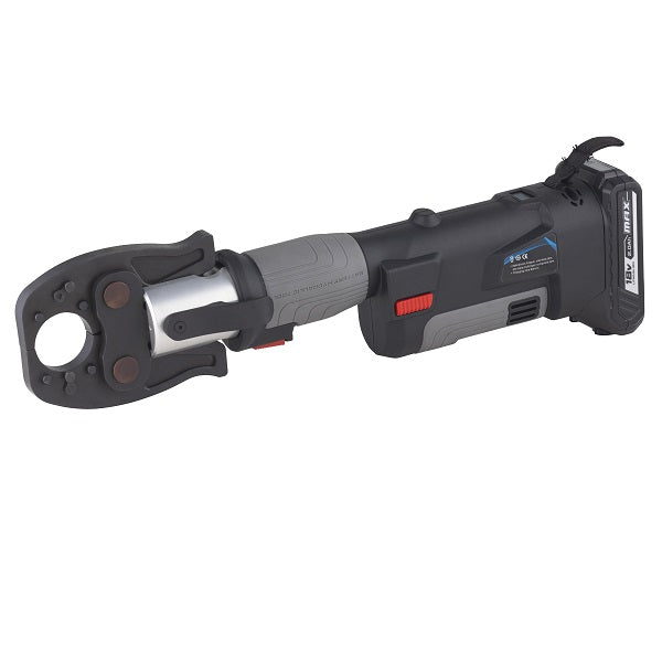 Movilidad y libertad: Con su batería potente y recargable, esta prensa le brinda total libertad de movimiento en la obra, sin cables que lo limiten. Es ideal para trabajos en exteriores o en lugares de difícil acceso debido a su diseño alargado, ocupando poco espacio en ancho, y con un cabezal giratorio a 90°