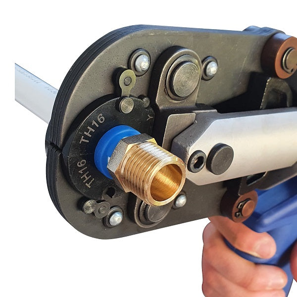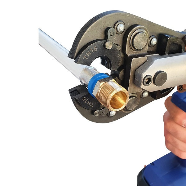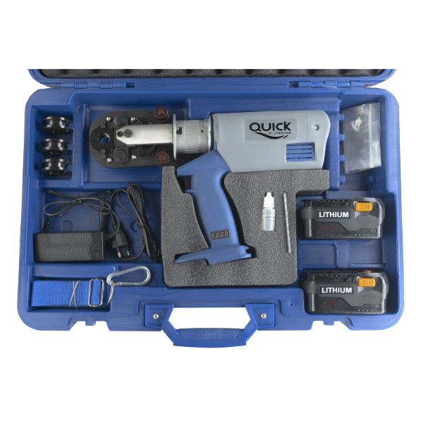 La prensa es entregada en una maleta compartimentada con todos sus accesorios indispensables para su buen uso : un cargador, dos baterias recargables, una correa de retención, un kit de mantenimiento y 4 insertos de prensado en diámetros 12 - 16 - 20 - 26 mm en perfil TH, el perfil más comunmente empleado en fontaneria Multicapa.