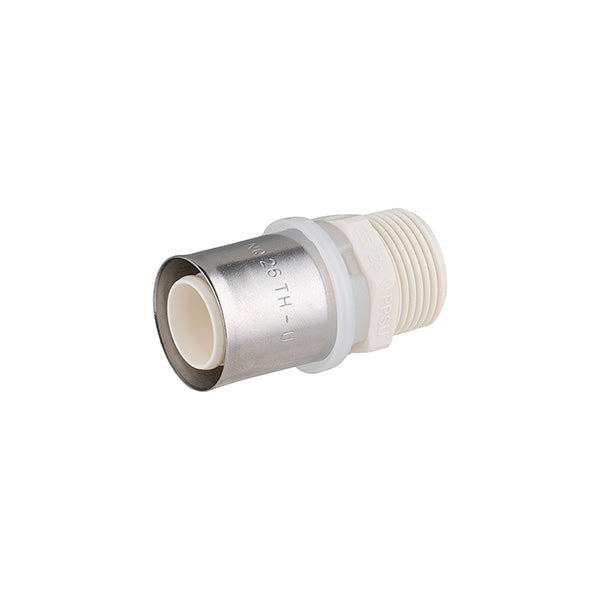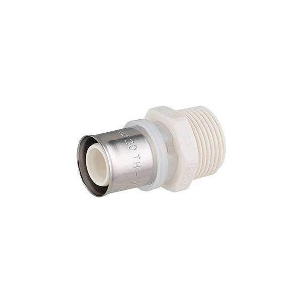 Se conecta mediante prensado a un tubo multicapa por un lado y mediante rosca macho por el otro para conectarlo a un aparato u otro racor.