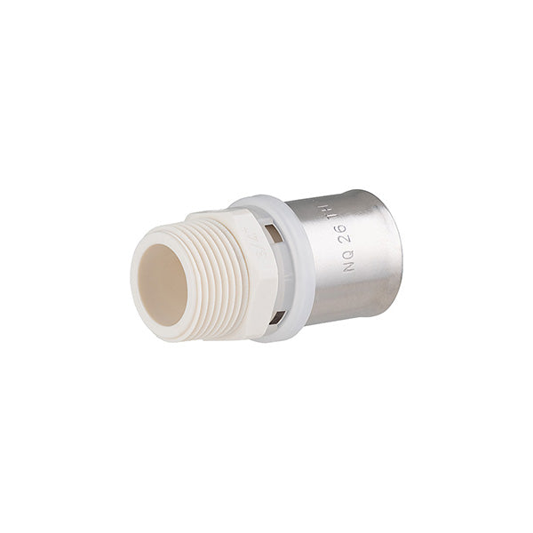 Conector para tubo multicapa. Los racores a presión de la marca Quick Plomberie están certificados multiperfil, para conectar con una máquina de prensar o una tenaza manual con insertos TH o U. El anillo blanco de HDPE permite comprobar la correcta posición del tubo en el conector antes del prensado.