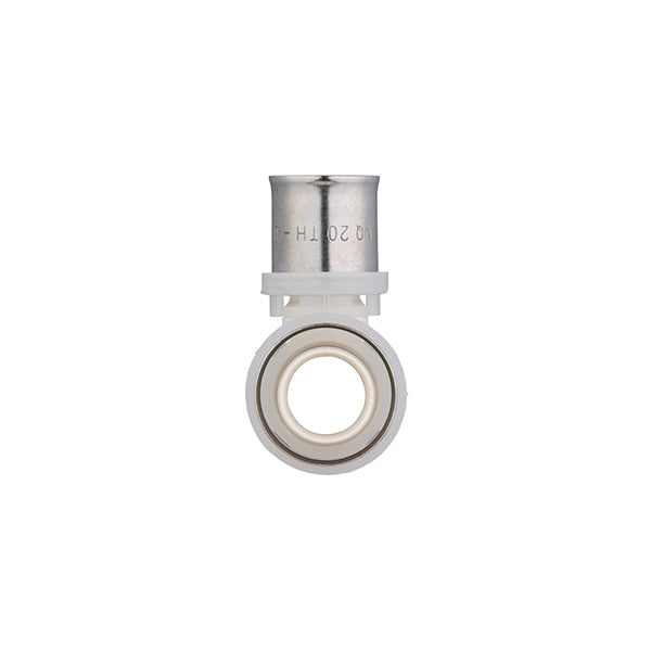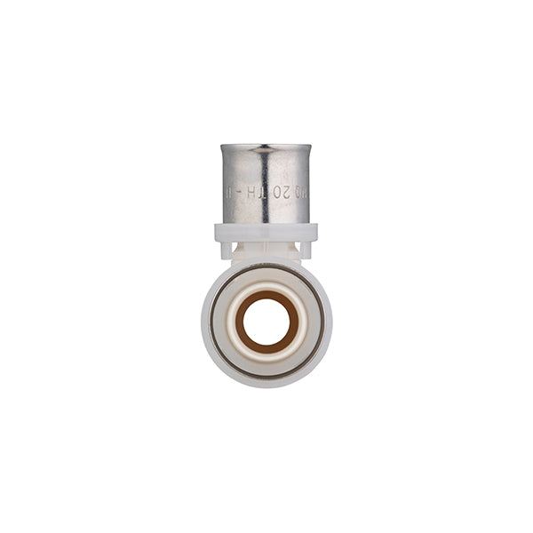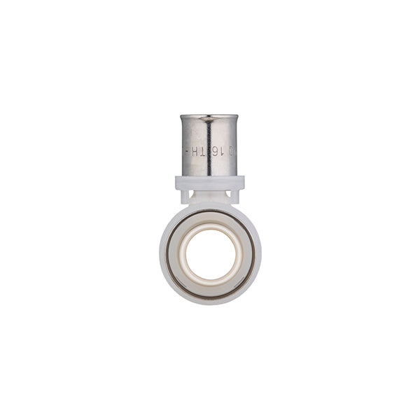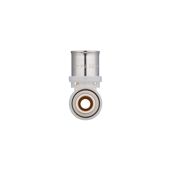 Conector para tubo multicapa. Los racores a presión de la marca Quick Plomberie están certificados multiperfil, para conectar con una máquina de prensar o una tenaza manual con insertos TH o U. El anillo blanco de HDPE permite comprobar la correcta posición del tubo en el conector antes del prensado.
